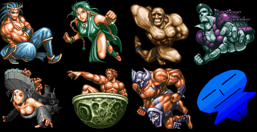 游戏继承了前作的所有角色,包括韦驮天、弁天、参孙和僵尸飞船人萨布,阿顿是那个浴缸类似物里的人,还有右下角的那个蓝色的奇怪物体叫做海人(Uminin)。新加入的角色包括菩提(菩提,Botei),另一个满身横肉的基佬,以及麻美(Mami)初世代人舰合一美少女而且他的甲板上有好多迷你筋肉人。每个角色都有一些非常玄妙的攻击招式,比如参孙会跳大神然后放屁攻击,而韦驮天会把他可爱的跟班小天使面容狰狞的什么鬼。所有的角色都会发射强力死光,随后也会陷入短暂的硬直。其他游戏中的一些角色也会在对战的背景中出现。