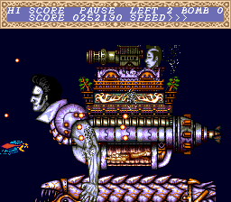 除了画面精度有所提升意外, 整个游戏其实挺无趣的,有一些关卡几乎完全照搬了PCE版本,我也不确定这算是致敬还是偷工减料。不过感觉上更像是故意的,毕竟这整个游戏就是一个拙劣的模仿。其中的一个Boss和R-type里面的一架飞船几乎一样,只是样子变成了一个背上背着飞船的基佬。如果你在游戏中中弹的话就会胯下冒烟然后乌烟瘴气地坠毁。